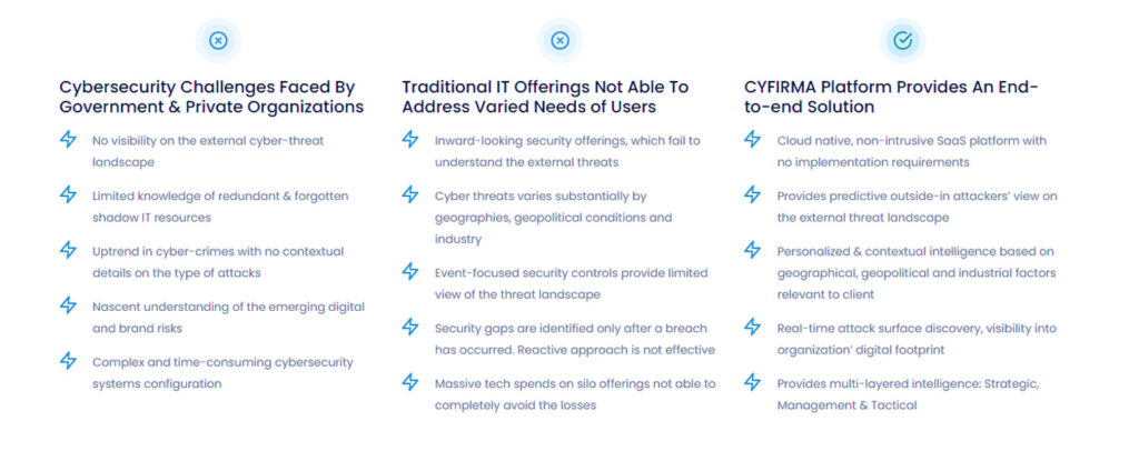 By combining cyber-intelligence with attack surface discovery and digital risk protection, CYFIRMA delivers predictive, personalized, contextual, outside-in and multi-layered insights to help clients prepare against upcoming attacks.